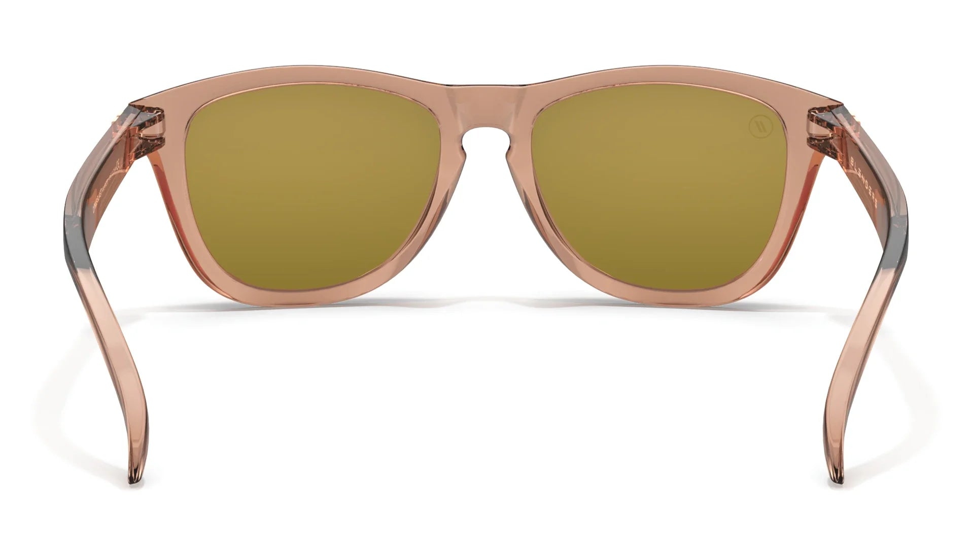 ‘Citrus Blast’ will have you going off thanks to its blow-away style. We took a classic shape and designed around durable crystal tan frames, applying shocks of peach at the temple stripes for accenting. The polarized champagne lenses shimmer with a delicate golden aesthetic, and everything is finished in high gloss for amped-up appeal. Boom! //