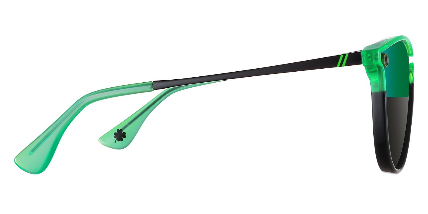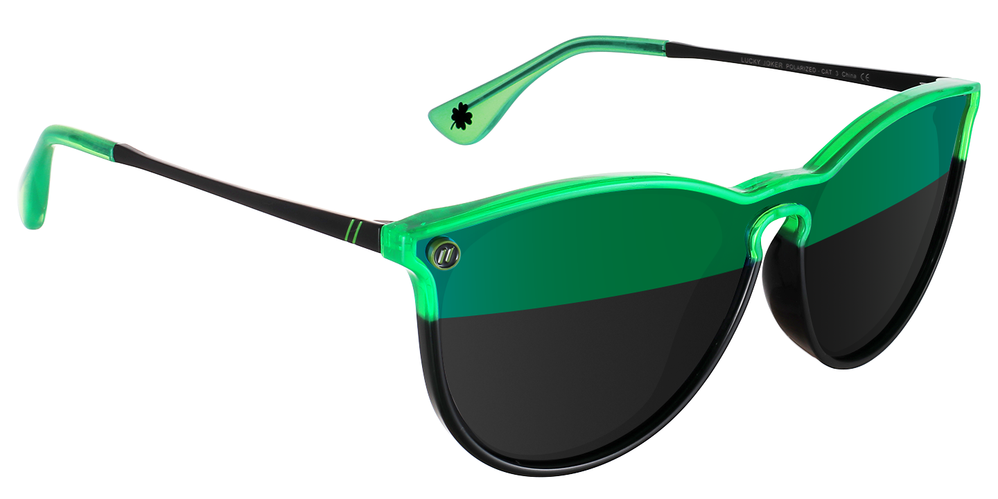Find fortune with our limited-edition St. Patrick’s Day sunglasses! ‘Lucky Joker’ is charmingly styled with an incredible split green mirror lens that’s exclusive to our ‘North Park X2’ collection. Featuring our new PureBlend polycarbonate lens, the lens delivers all-world color and clarity in tandem with a masked effect for a slick look. The frame is a total wild card, fading from crystal green to crystal black. Matte-finished metal defines the temples, while a clover imprinted at the left tip stacks the odds ever in your favor. //