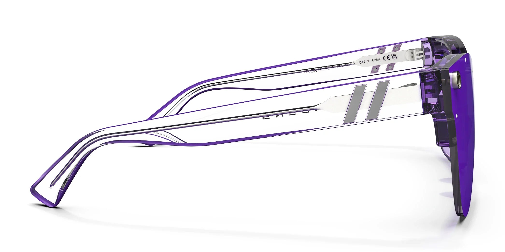 Polarized, progressive, and dripping with color – ‘Neon Gypsy’ is “bright done right.” These cat-eye sunglasses stun with a single-lens look and purple temple pinstriping for a violaceous vibe. Also featuring our premium PureBlend Lens for superior scratch resistance. //